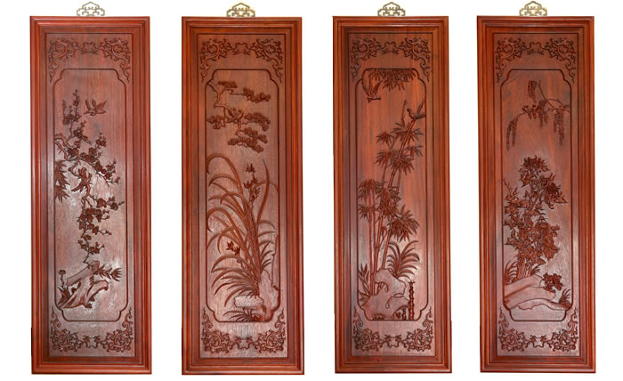 江蘇中尊木業有限公司屏風系列產品:梅蘭竹匊掛屏、四季花折屏四件套等。